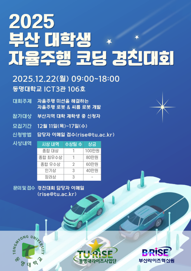 RISE사업단에서 대학 간 공유·협력을 기반으로 지역 인재 양성을 위한 부산 대학생 자율주행 코딩 경진대회를 개최하고자 합니다.