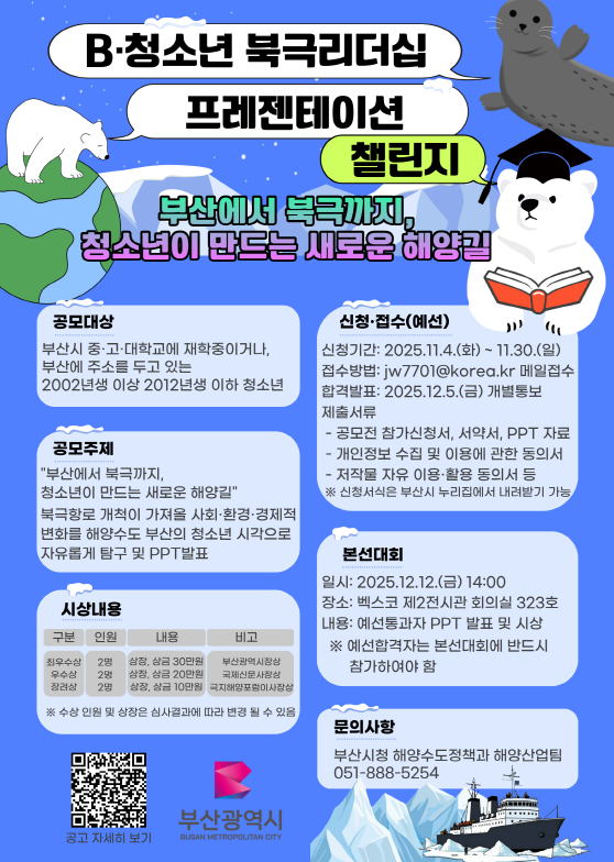 2025년 제10회 북극협력주간 부산관 개최에 따라 부산 청소년이 북극항로 시대를 선도하는 주역으로서 미래 극지 인재로 성장하기 위한 「B·청소년 북극리더십 프레젠테이션 챌린지」 공모전을 다음과 같이 개최하오니 본 공모전에 관심 있는 분들의 많은 참여 바랍니다.