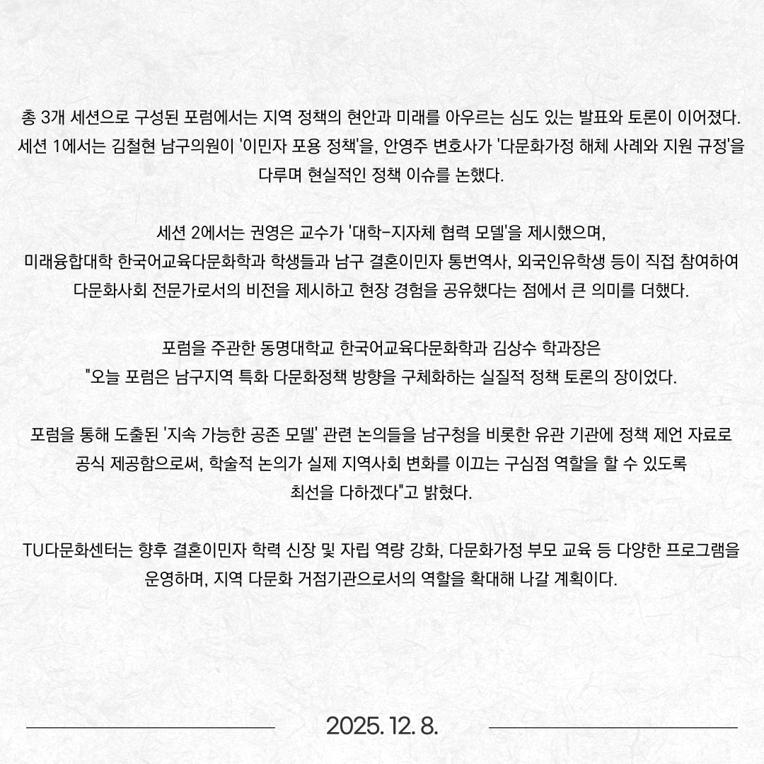 “다문화 공존 모델 찾자” 동명대, 부산 남구청과 정책 포럼
