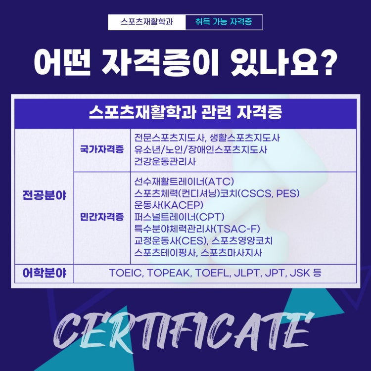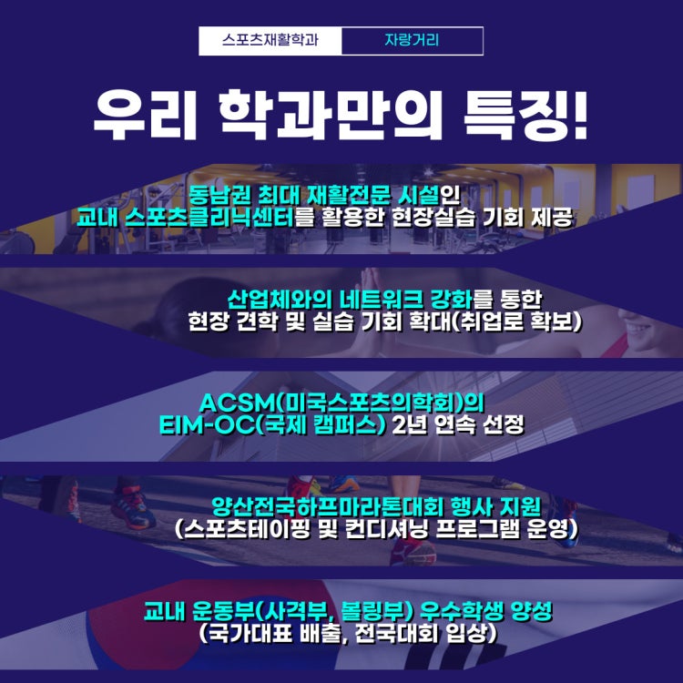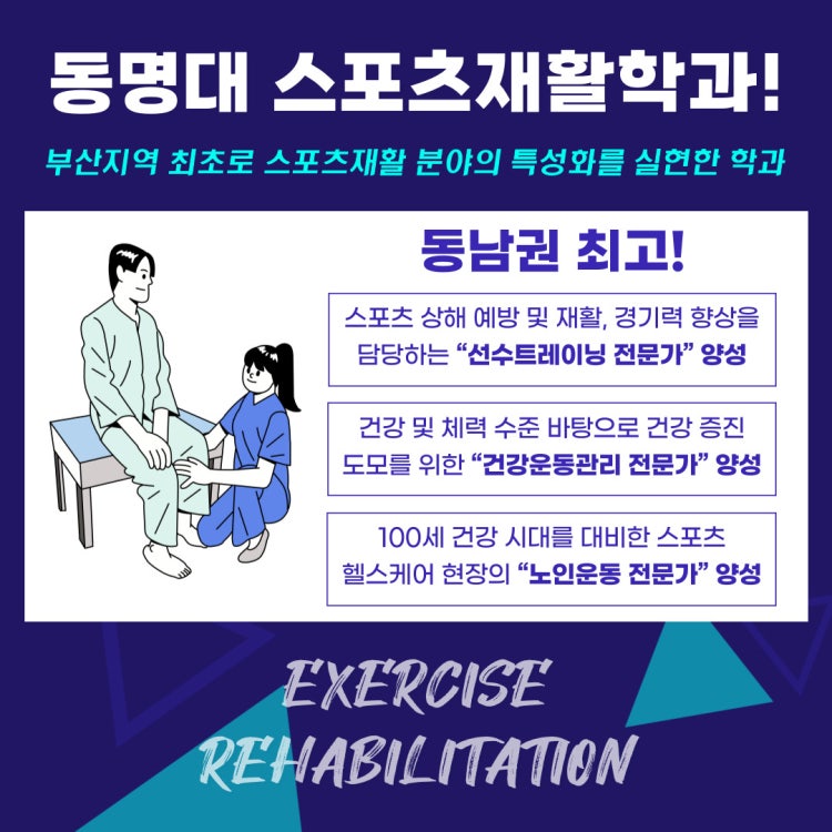 동명대학교 스포츠재활학과는 스포츠 영역의 시대적 트랜드에 부응하기 위해 2020년 부산 지역 최초로 신설하여 현장 중심의 실무 능력을 갖춘 스포츠 재활에 특화된 인재를 양성하고 있습니다. 이를 위해 국가자격증 취득을 지원하는 재학생 멘토-멘티 밀착형 교육, 현장 전문가와 학교 수업을 결합한 산학융합강좌, 직업 현장에 직접 찾아가 교육 받는 더블멘토링 등 다양한 비교과 프로그램 및 전공 동아리 운영을 통하여 스포츠재활 분야에 특화된 기능을 보유 할 수 있는 시스템을 구현하고 있으며, 또한 최신 스포츠과학 검진장비를 교내 스포츠클리닉 센터에 구축하여 다양한 실습기회를 제공하고 있습니다. 그리고 이를 산업체 전문재활센터의 현장 실습과 연계하는 단계적 교육방법을 적용하고 있습니다.