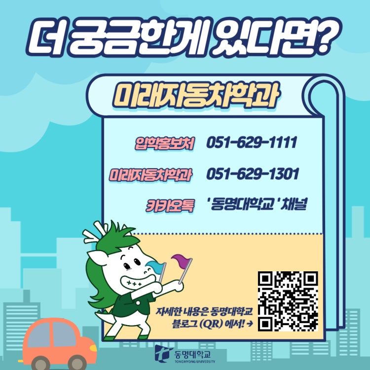 학교 홈페이지에서 공과대학에 관한 다양한 학과를 확인 하실 수 있으며, 상담이 필요하신 경우에는 카카오톡 채널에서 동명대학교를 검색하시면 카톡으로도 언제든지 상담이 가능합니다!