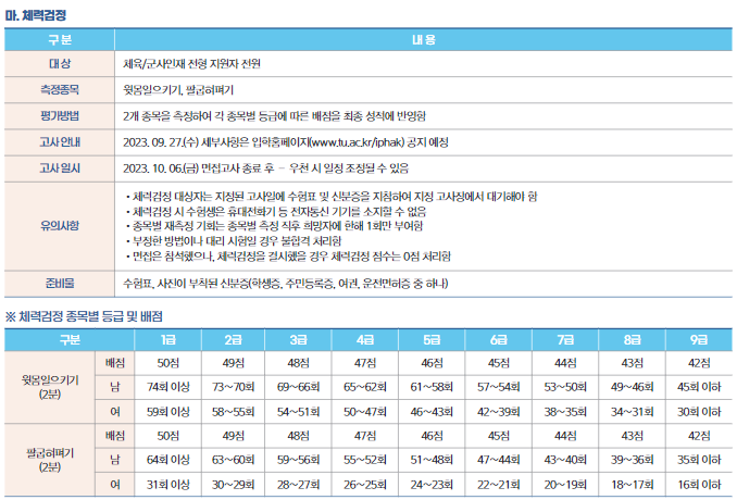 반영비율 : 학생부 교과 50% 면접 40% 체력검정 10% 반영