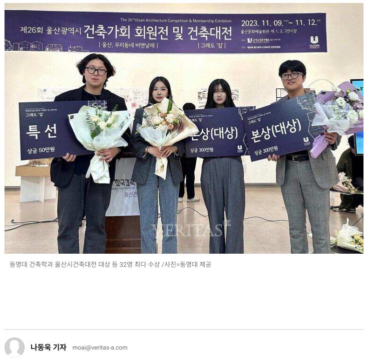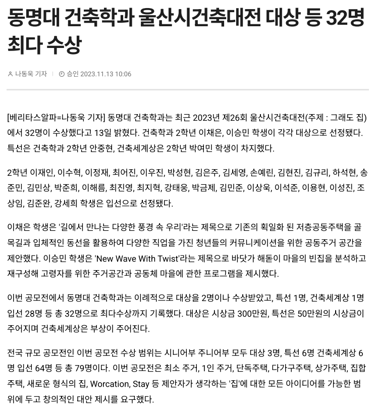 동명대 건축학과 울산시건축대전 대상 등 32명 최다 수상