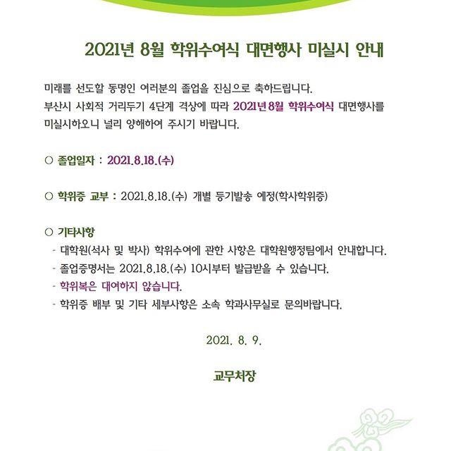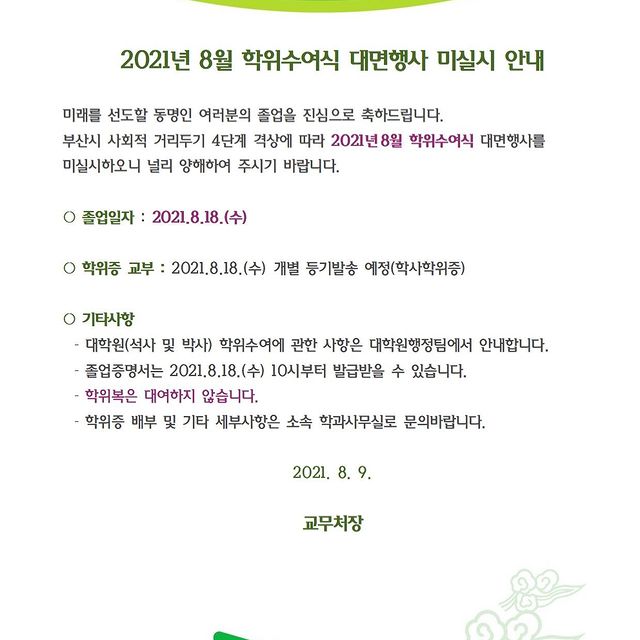 2021년 8월 학위수여식 대면행사 미실시 안내