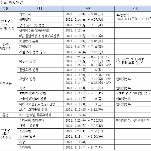 2021학년도 하계방학 중 학사일정 안내