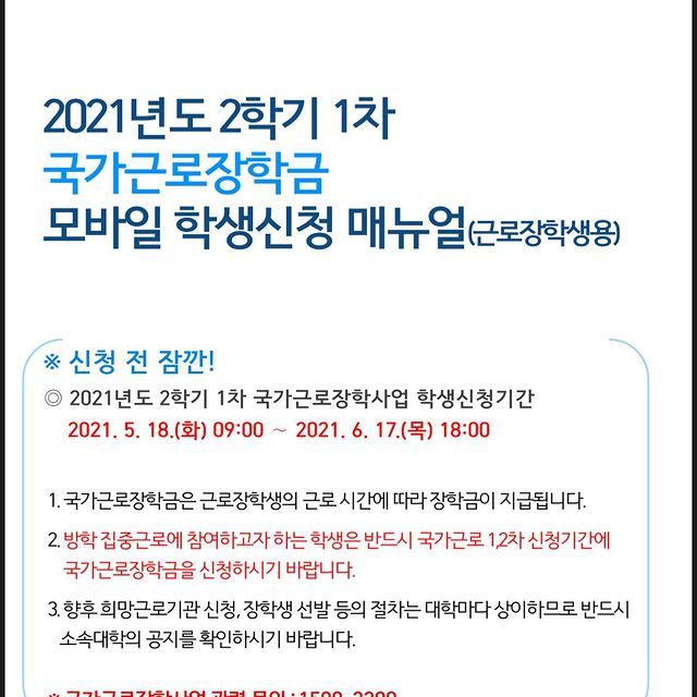 2021학년도 2학기 1차 국가근로장학금 학생신청 기간을 안내하오니, 학생들의 많은 신청 바랍니다.