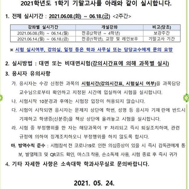2021학년도 하계 계절학기 개설과목 현황