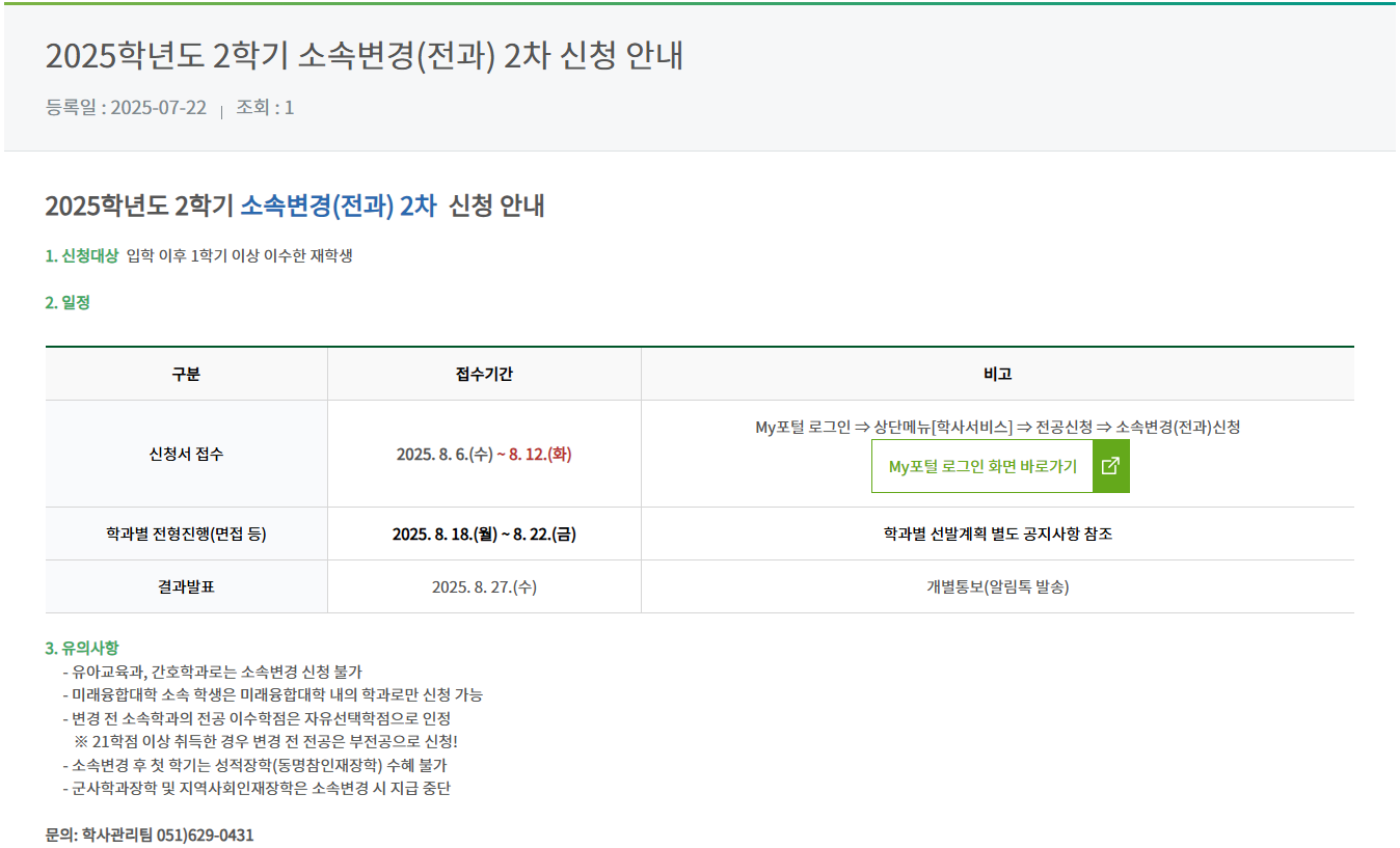 2025학년도 2학기 소속변경(전과) 2차 신청 안내