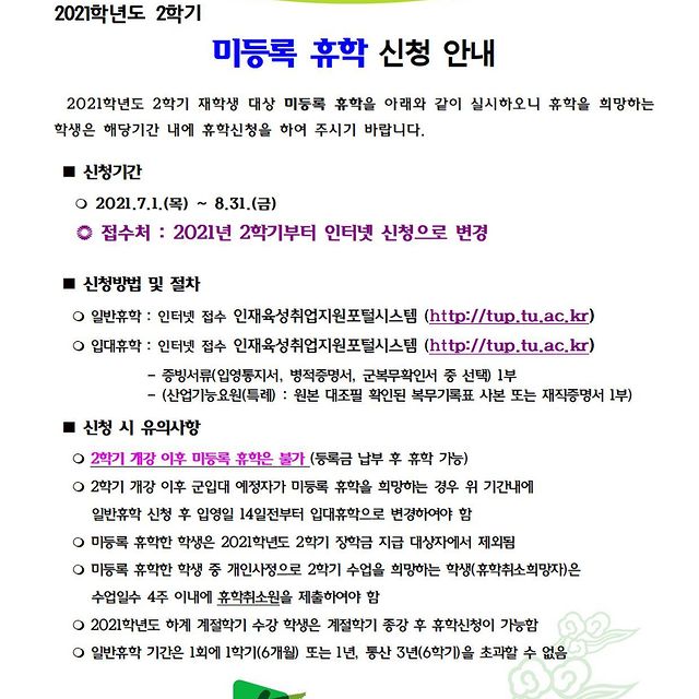 휴학 접수방법 변경되었습니다. 입대휴학 및 미등록 휴학예정인 학생분들은 참고하셔서 신청하시면됩니다. 안내문에 첨부된 유의사항 꼭 확인하시고