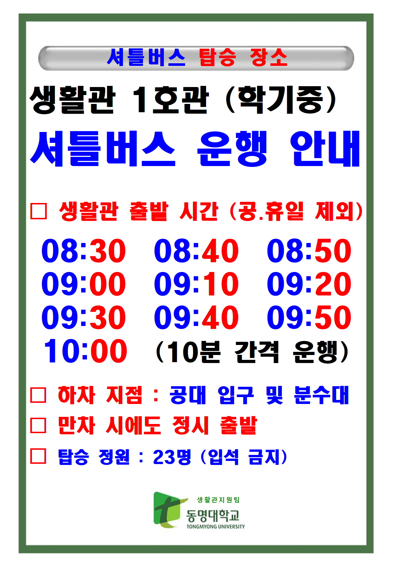 2026학년도 1학기 동명생활관 1호관 셔틀버스를 아래와 같이 운행하오니 많은 이용바랍니다.