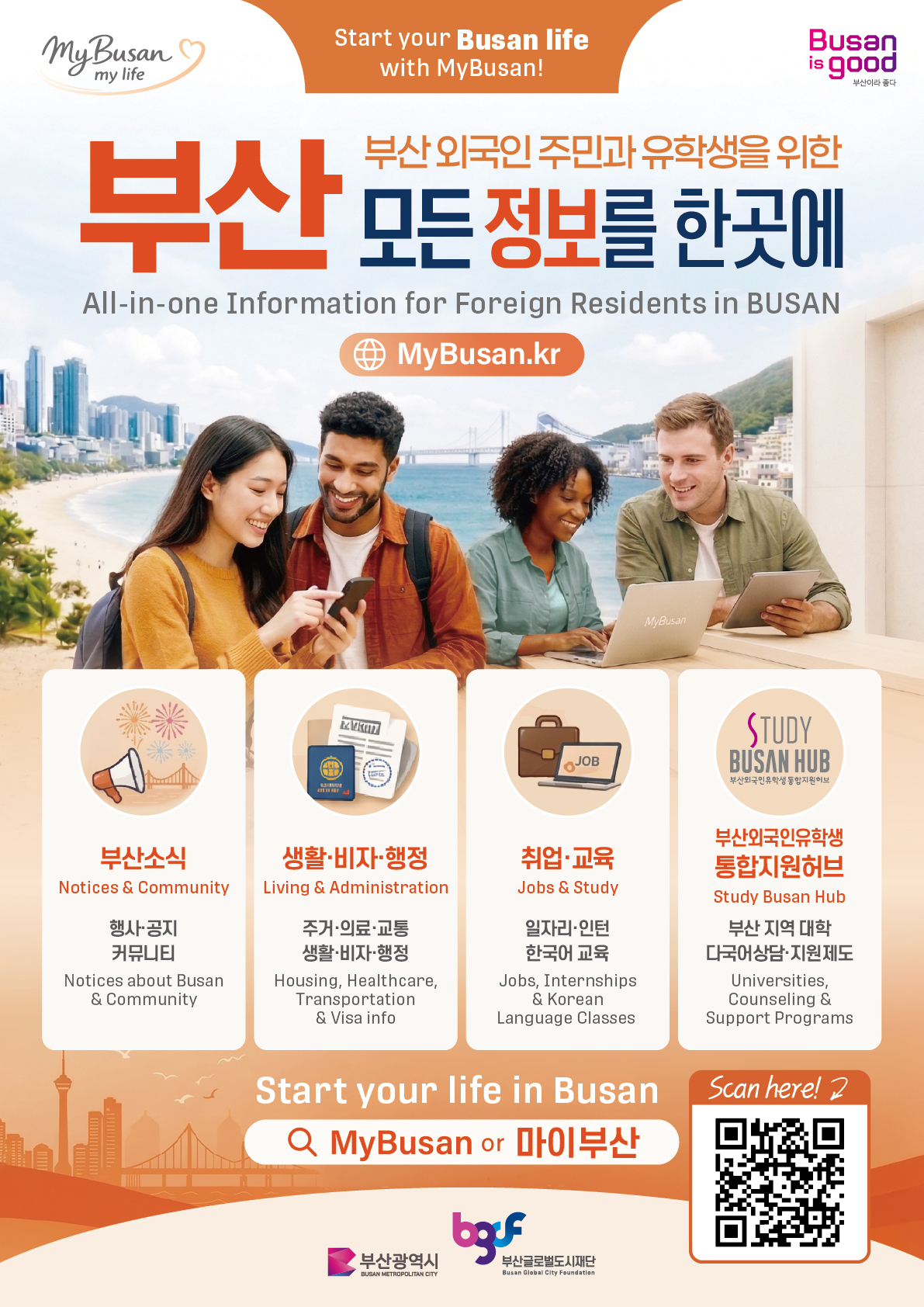 釜山市为提升外国居民及留学生在釜山的生活便利性,并支持其稳定居住,运营外国人综合信息平台「MyBusan(我的釜山)」。
