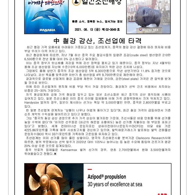 2021년 8월 11일 수요일 일간조선해양일보입니다.