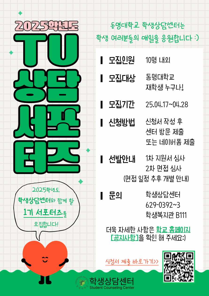 [학생상담센터] 2025학년도 TU-상담서포터즈 모집 안내