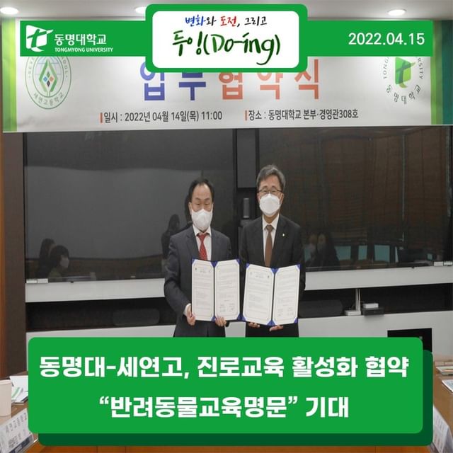 슨반려동물 관련 혁신 교육에 최근 발빠르게 뛰어든 부산 세연고등학교(교장 조재형)와 반려동물 단과대학을 신설한 동명대학교(총장 전호환)가 맞손