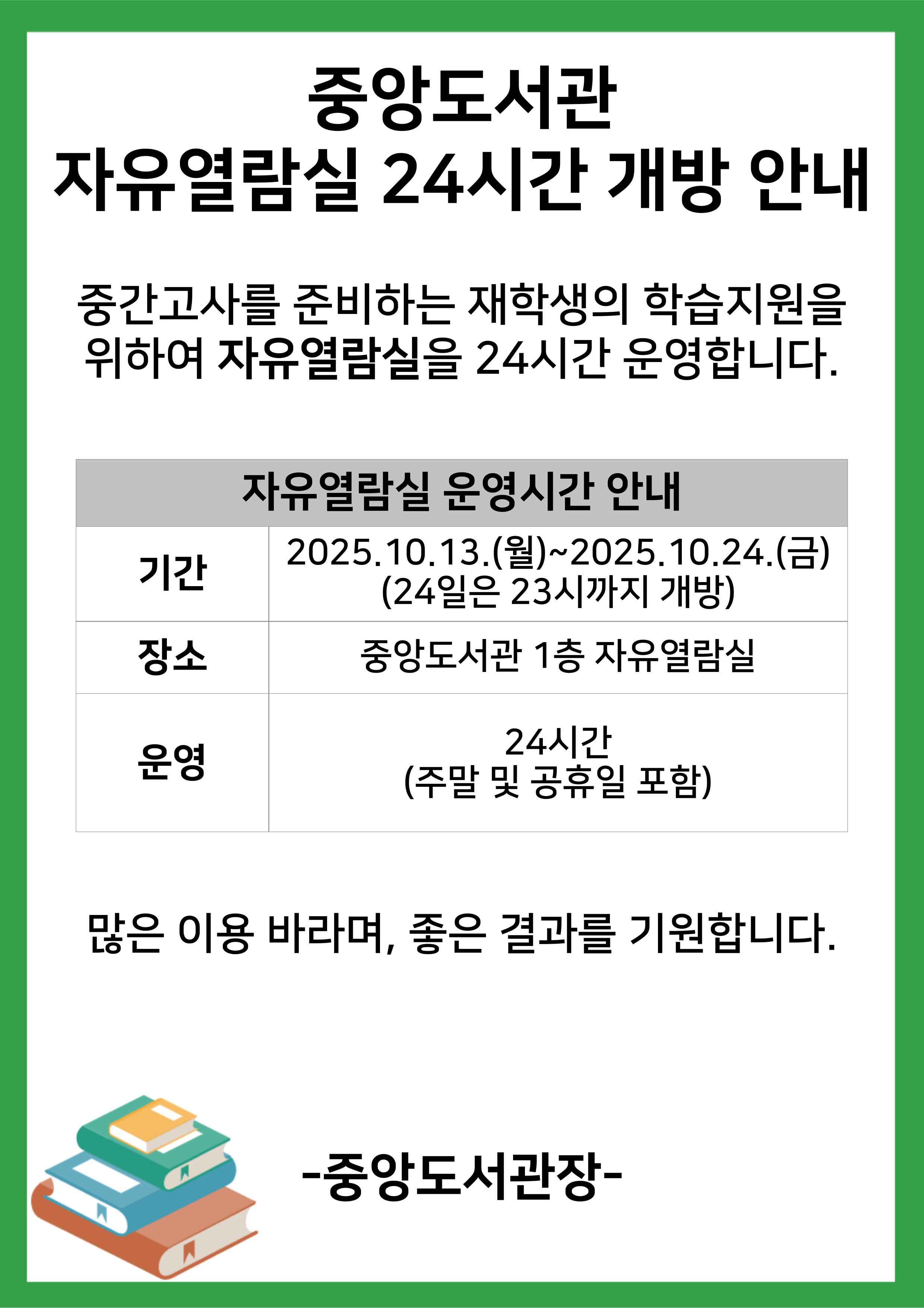 [중앙도서관] 중간고사 기간 열람실 개방시간 연장안내