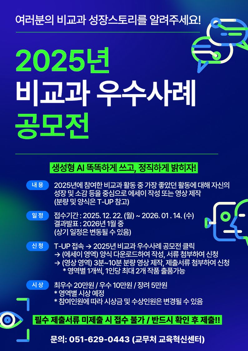 1. 비교과 활동 성과공유를 위하여 "2025년 비교과 우수사례 공모전"을 진행하오니 많은 참여 부탁드립니다.