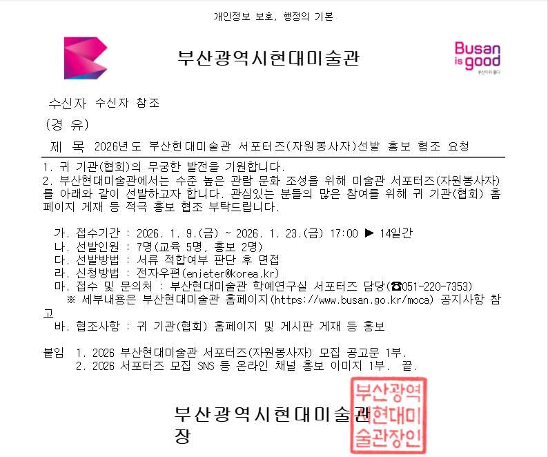 2026년도 부산현대미술관 서포터즈(자원봉사자)선발 안내