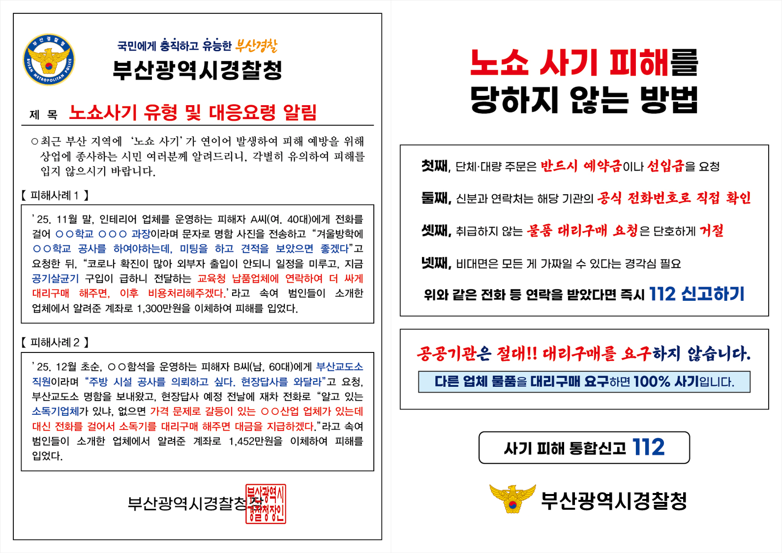최근 부산지역에 '노쇼 사기'가 연이어 발생하여 피해예방을 위해 노쇼 유형 및 대응요령을 알려드리니 사기피해 예방에 도움되시기 바랍니다.