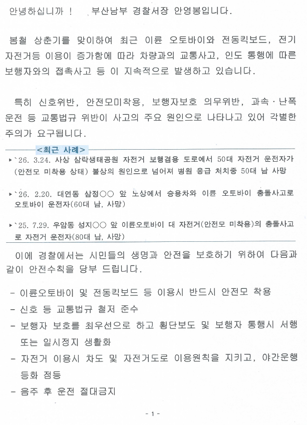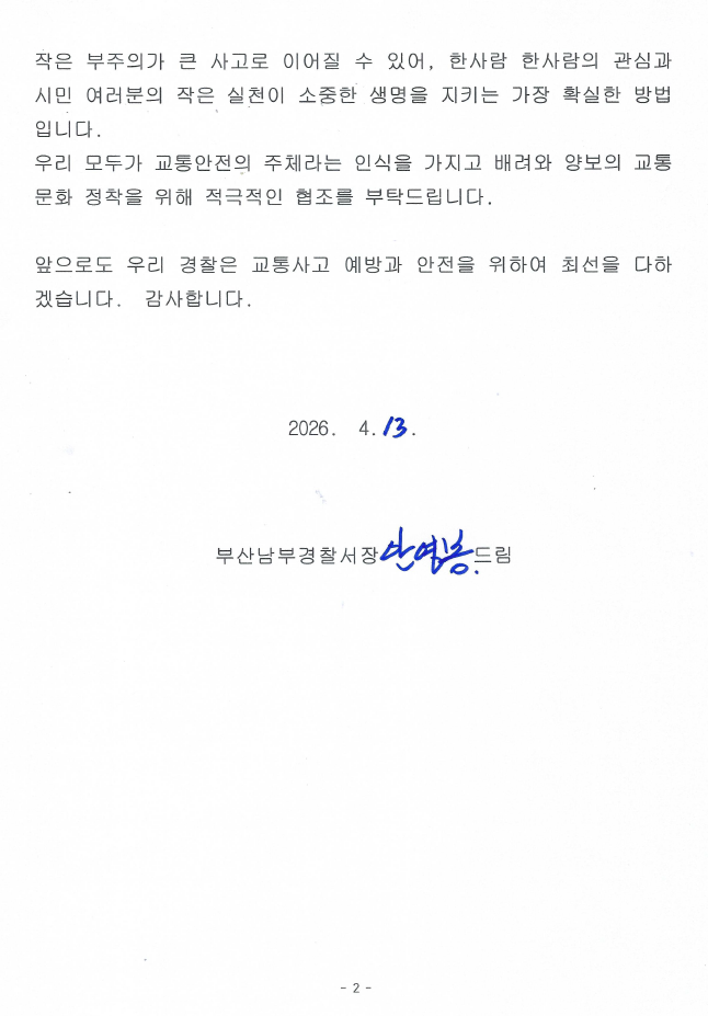 학생 교통안전을 위한 부산남부경찰서장 서한문
