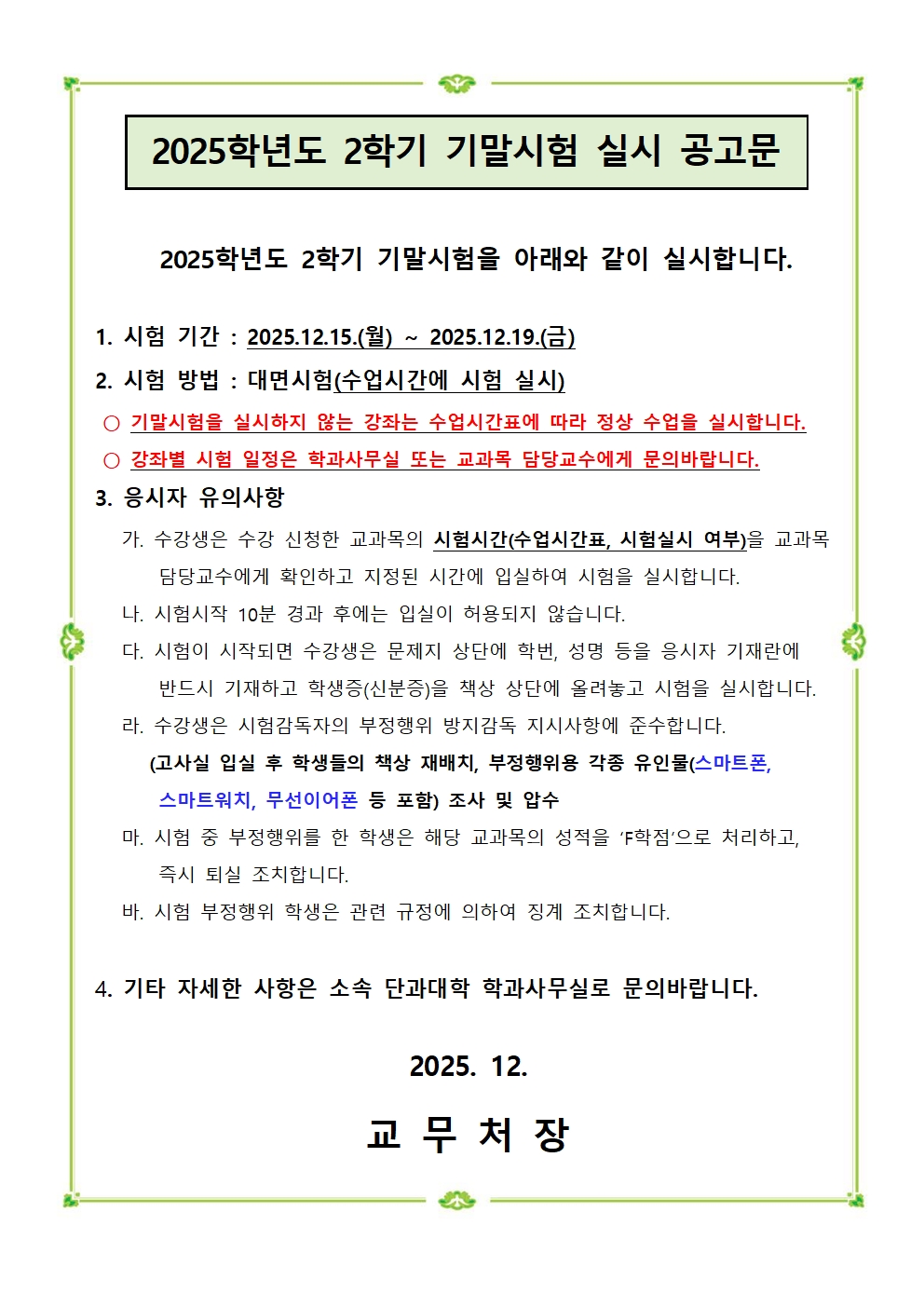 2025학년도 2학기 성적평가 기준 및 성적처리 일정 안내