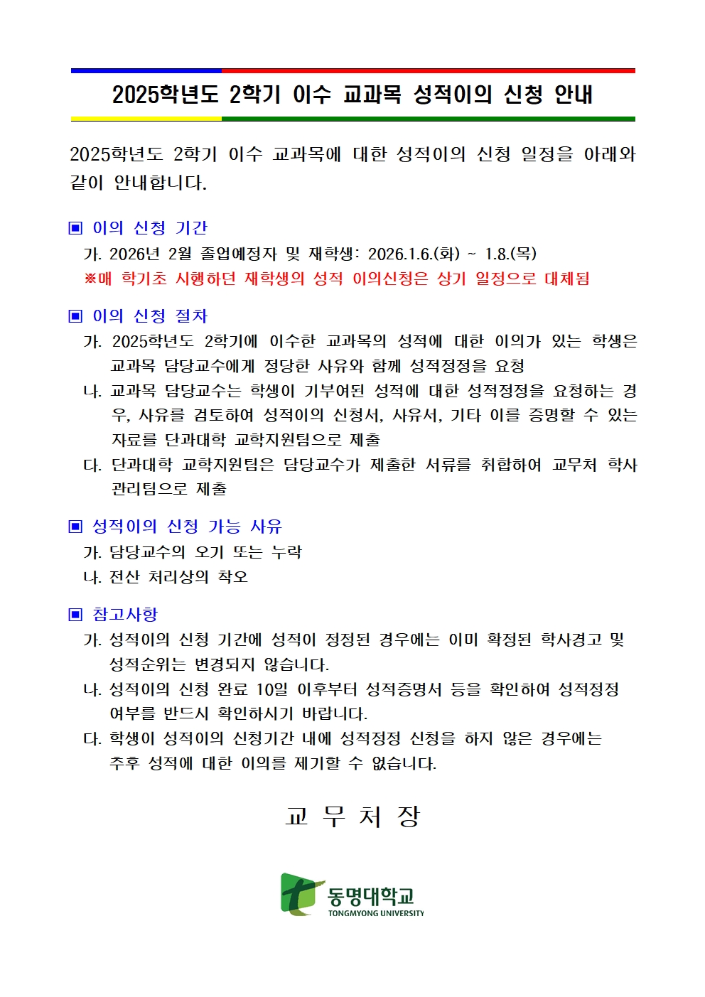 2025학년도 2학기 이수교과목 성적이의 신청 안내