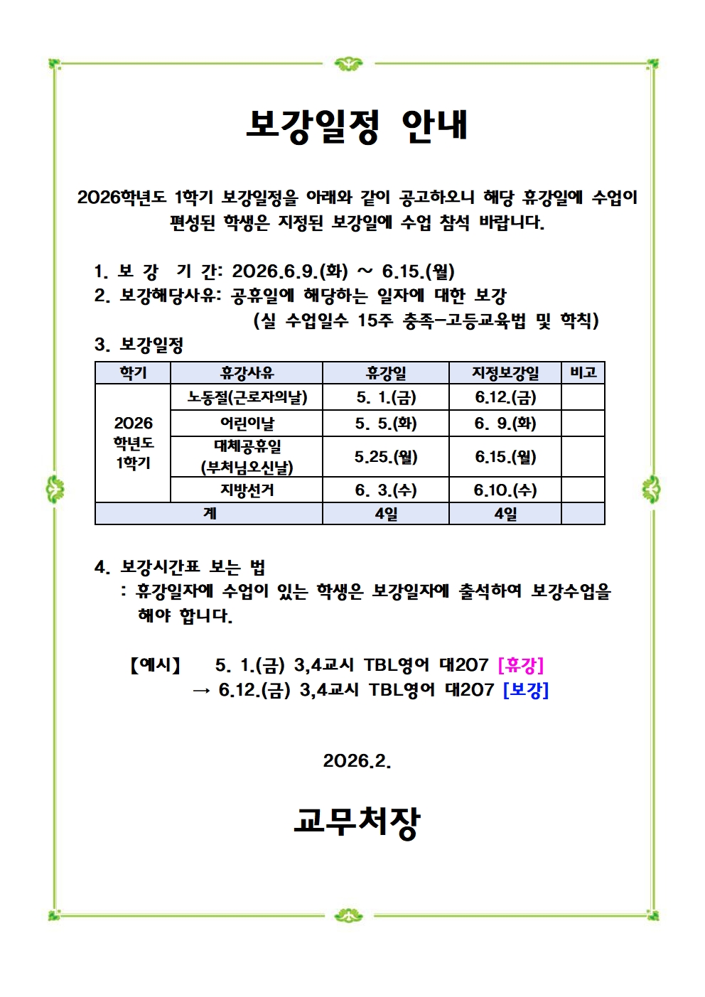 2026학년도 1학기 보강 기간 안내
