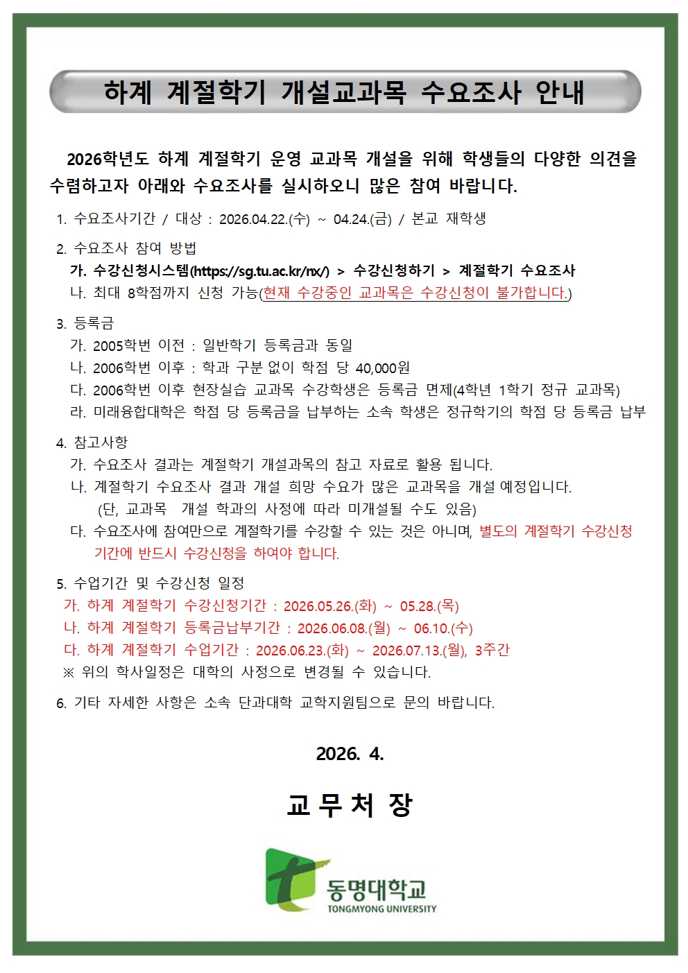 2026학년도 하계 계절학기 개설 교과목 수요조사 실시 안내