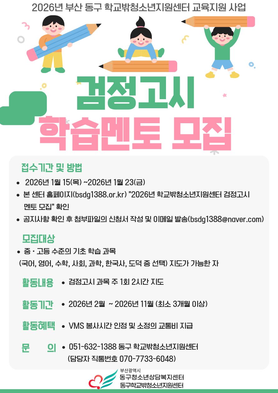 2026년 부산 동구 학교밖청소년지원센터 '꿈드림 학습 멘토'모집 안내