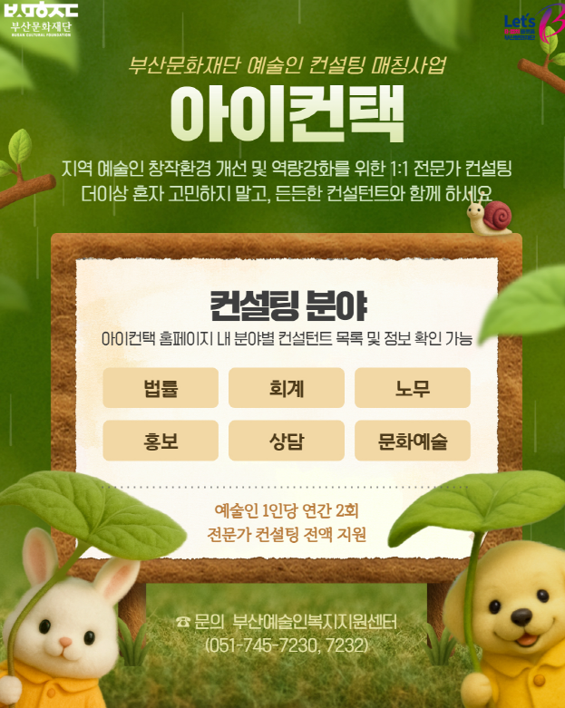 부산문화재단 예술인복지지원센터에서는 지역예술인 및 예비예술인이 창작활동에서 겪는  다양한 문제점을 전문가에게 컨설팅 받을 수 있는 예술인 컨설팅 매칭사업 &아이컨택&을  운영하고 있습니다