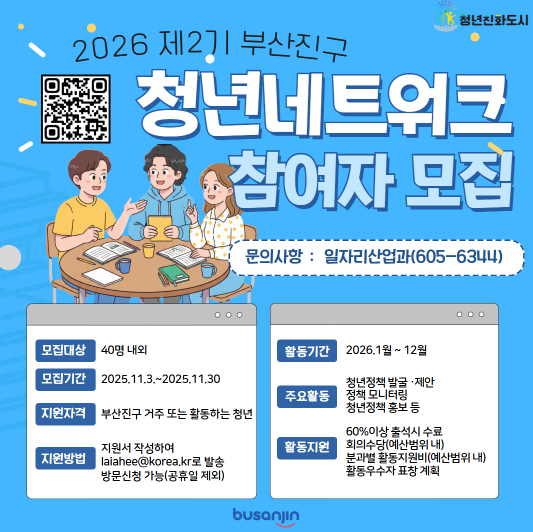 청년의 정책 참여를 확대하고 청년이 체감하는 청년정책 추진을 위해「제2기 부산진구 청년네트워크」구성·운영하고자  활동위원을 모집하고자 합니다.
