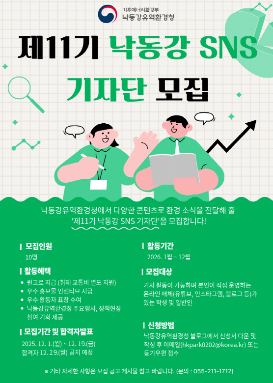 낙동강유역환경청에서는 2026년 한 해 동안 다양한 환경정책에 대하여 SNS에서 홍보활동을 실시할 낙동강 SNS 기자단을