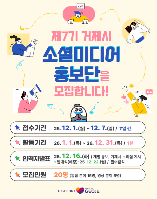 2026년부터 새로이 활동을 시작할 제7기 거제시 소셜미디어 홍보단 모집이 진행중이오니 학생들의 많은 참여바랍니다.