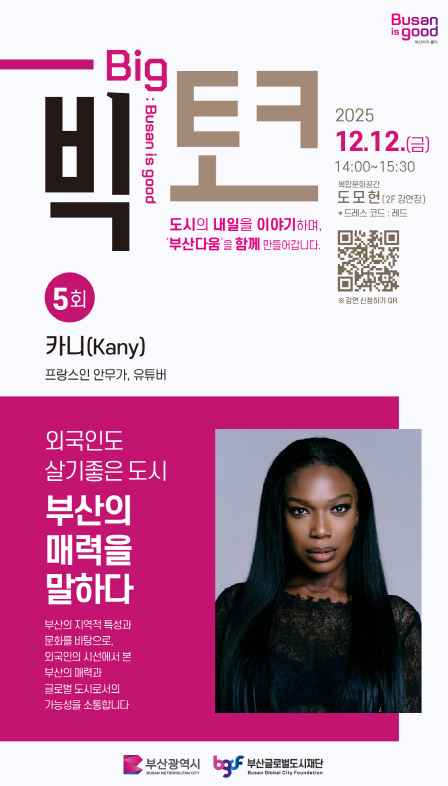 부산글로벌도시재단은 ‘글로벌허브도시 부산’만의 매력을 조명하는 열린 소통 강연인「2025 빅(Big) 토크」를 운영해 오고 있습니다.