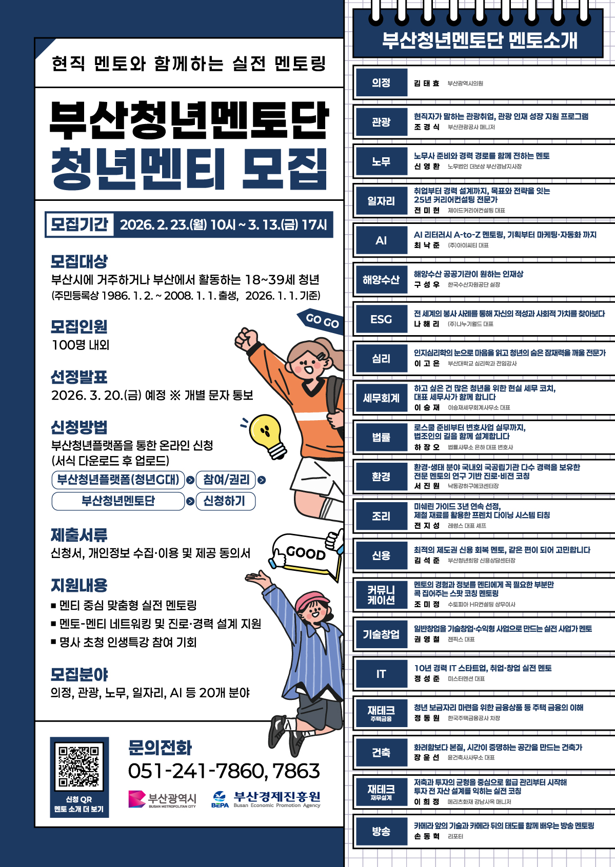 부산시에서는 지역 청년들의 진로 탐색 및 취업, 창업 역량 강화를 지원하고, 분야별 전문 멘토와의 연계를 통해 실질적인 성장 기회를 제공하고자 「부산청년멘토단 운영」사업을 추진합니다!