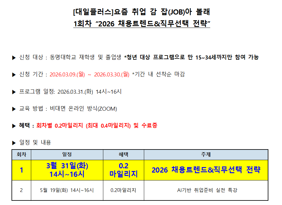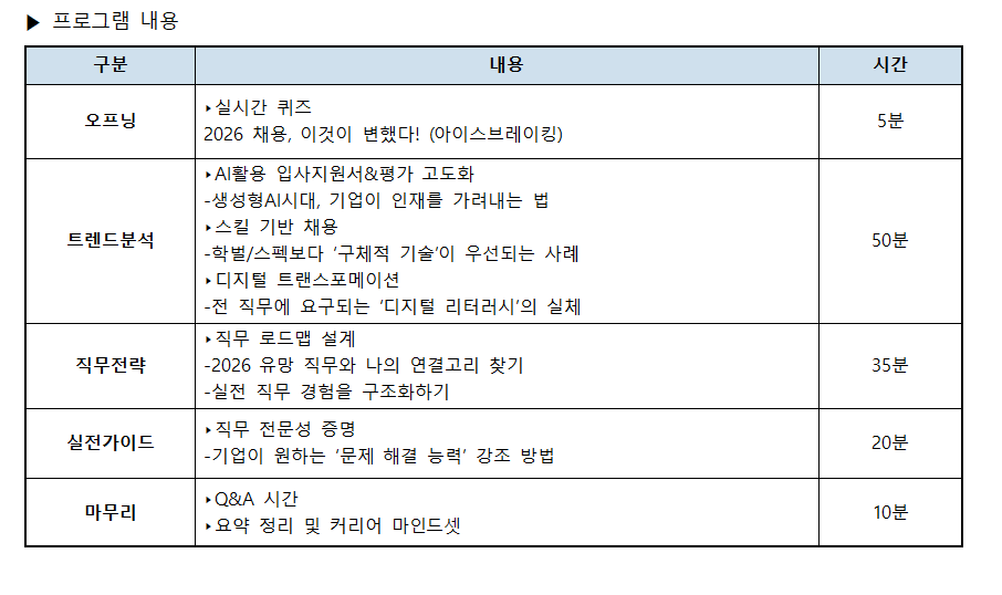 [비교과 신청 안내] 요즘 취업 감 잡(JOB)아 볼래? 1회차 “2026 채용트렌드&직무선택 전략”