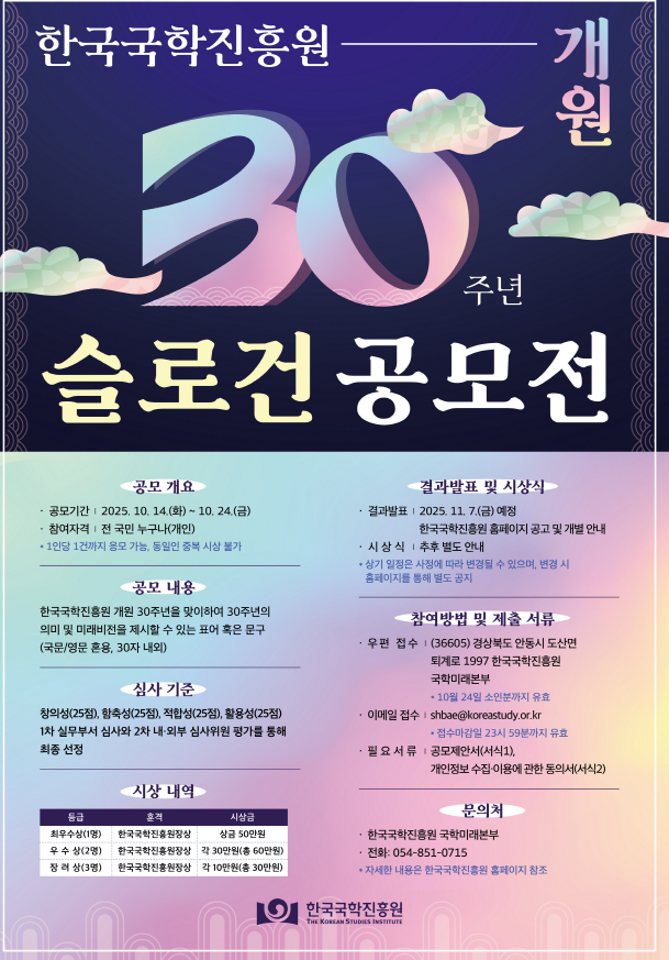 1) 공 모 명:『2026년 한국국학진흥원 개원 30주년 슬로건』
