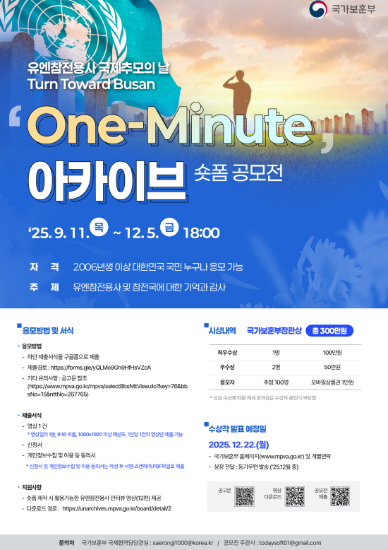 국가보훈부는 22개국 유엔참전용사에 대한 기억과 감사의 메시지를 확산하기 위해, 유엔참전용사 디지털 아카이브에 탑재된 유엔참전용사 인터뷰를 활용한 숏폼 공모전을 아래와 같이 연장하여 추진하고 있습니다.