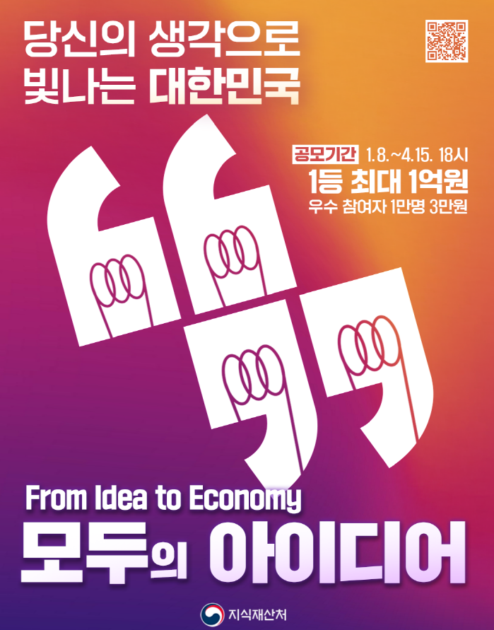 ◇ 공모 부문 : ① 정부·기업 과제 해결을 위한 아이디어, ‘지정공모’ ◇ 참가 대상 : 아이디어를 보유한 대한민국 국민 누구나 ◇ 접수 기간 : ’26. 1. 8.(목) ∼ ’26. 4. 15.(수) 18시 ◇ 접수 방법 : ‘모두의 아이디어’ 공식 홈페이지(www.모두의아이디어.kr) 회원가입, 공모 부문 선택 후 아이디어 제출 ◇ 포 상 : 총 7.8억원 / 1만명 내외 • (우수포상) 금상 20점(장관상, 1천만원), 은상 20점(지식재산처장상, 500만원), 동상 20점(한국발명진흥회장상, 300만원) • (왕중왕전*) 1등 1점(1억원), 2등 1점(3천만원), 3등 1점(2천만원) * 우수포상 금상 수상자 중 별도 선정 예정으로, 상금은 금상 상금(1천만원) 포함 • (참여포상*) 참여상 1만점(3만원, 지역화폐 또는 문화상품권) * 1차심사(서면심사) 결과 상위 1만건 아이디어 대상 지급 ◇ 문 의 처 : 「모두의 아이디어」 대국민 상담센터(☎1811-6095) |