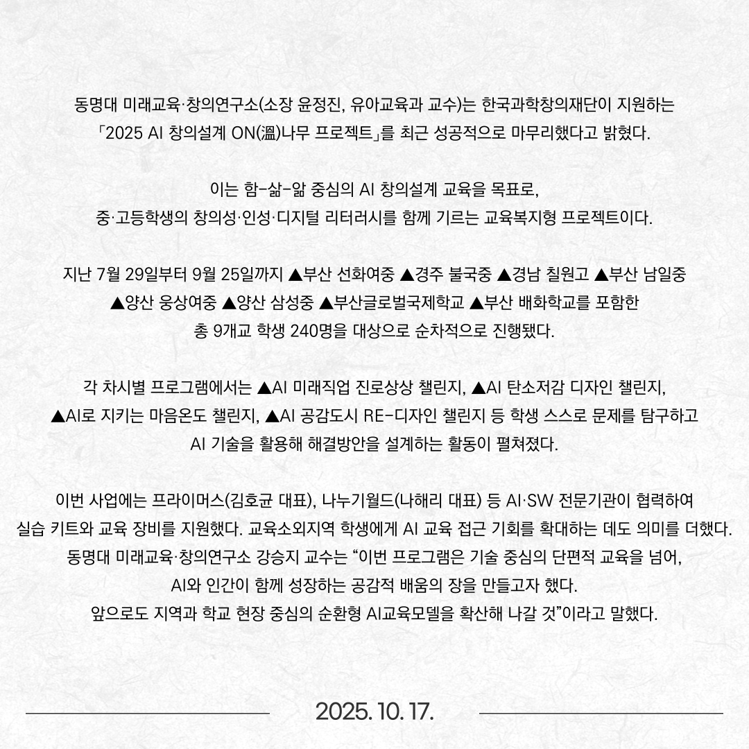 미래교육·창의연구소, 8개 중·고교서 ‘AI 창의설계 ON(溫)나무 프로젝트’