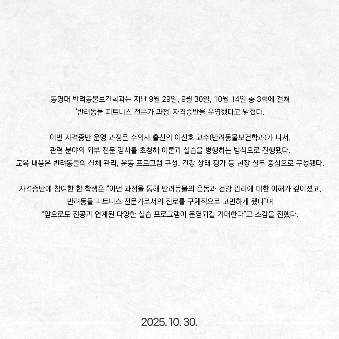 동명대 반려동물보건학과, ‘반려동물 피트니스 전문가 과정’ 자격증반 운영