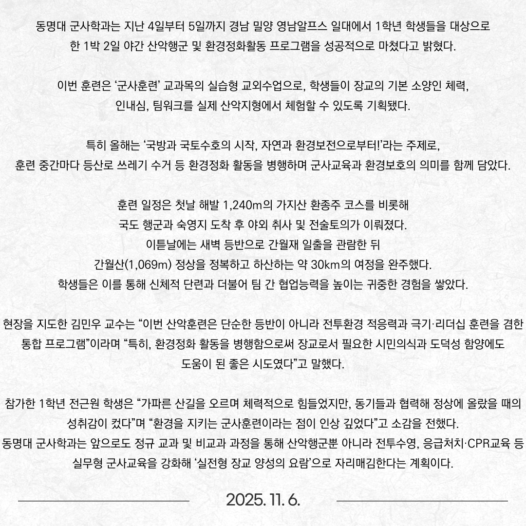 동명대 군사학과, 야간 산악행군 훈련 및 환경정화활동 실시