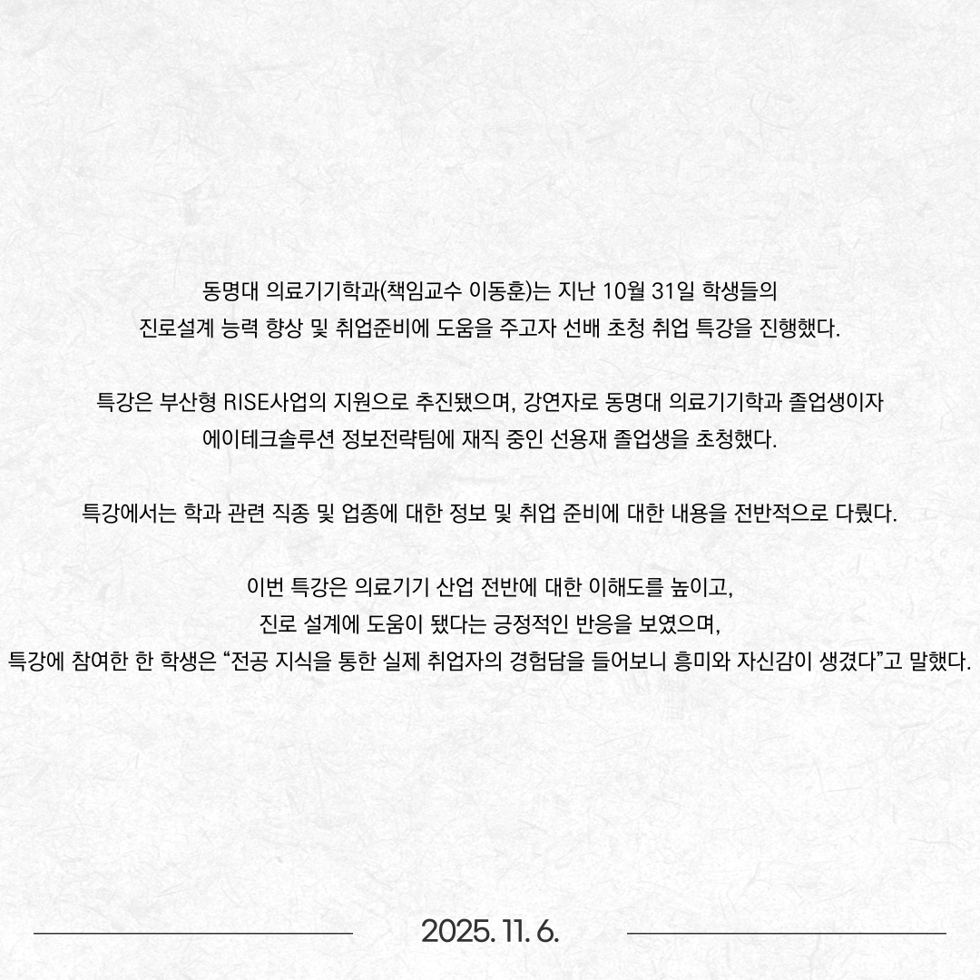 동명대, 의료기기 산업 맞춤형 선배 초청 특강 성료