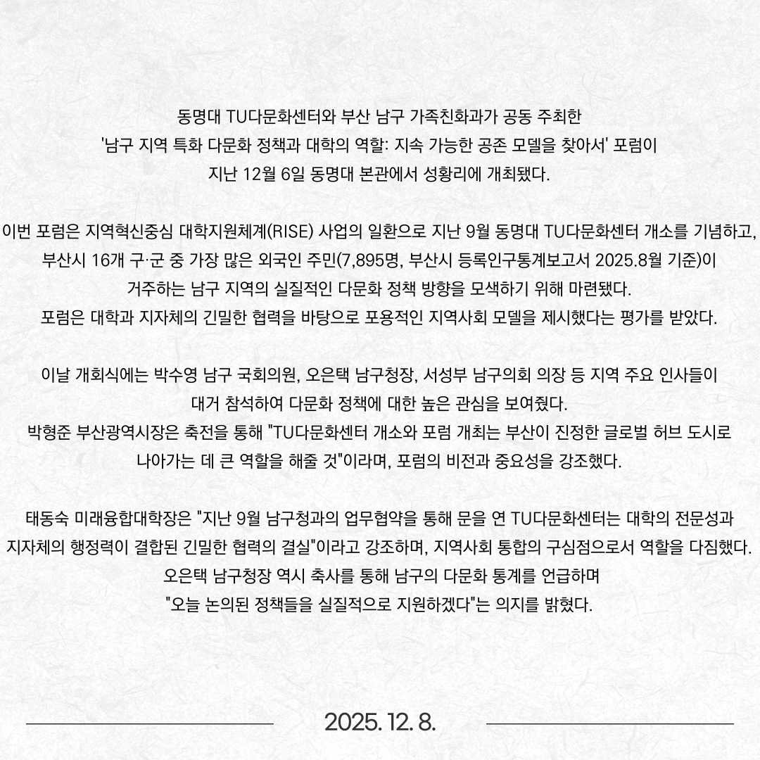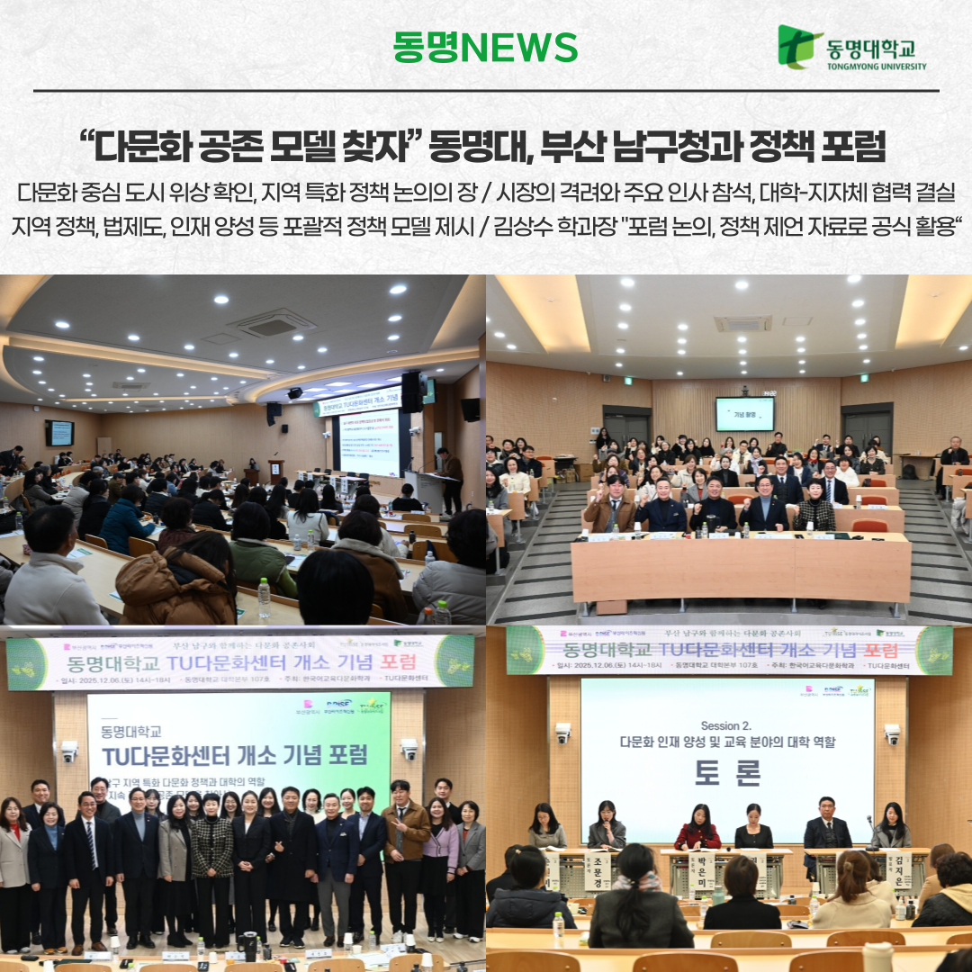 “다문화 공존 모델 찾자” 동명대, 부산 남구청과 정책 포럼