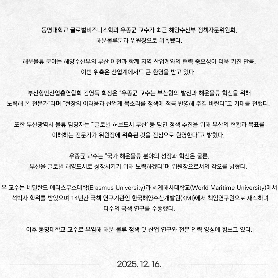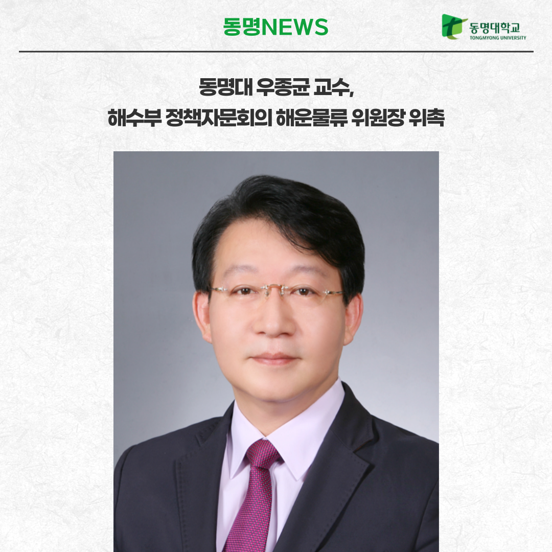 동명대 우종균 교수, 해수부 정책자문회의 해운물류 위원장 위촉
