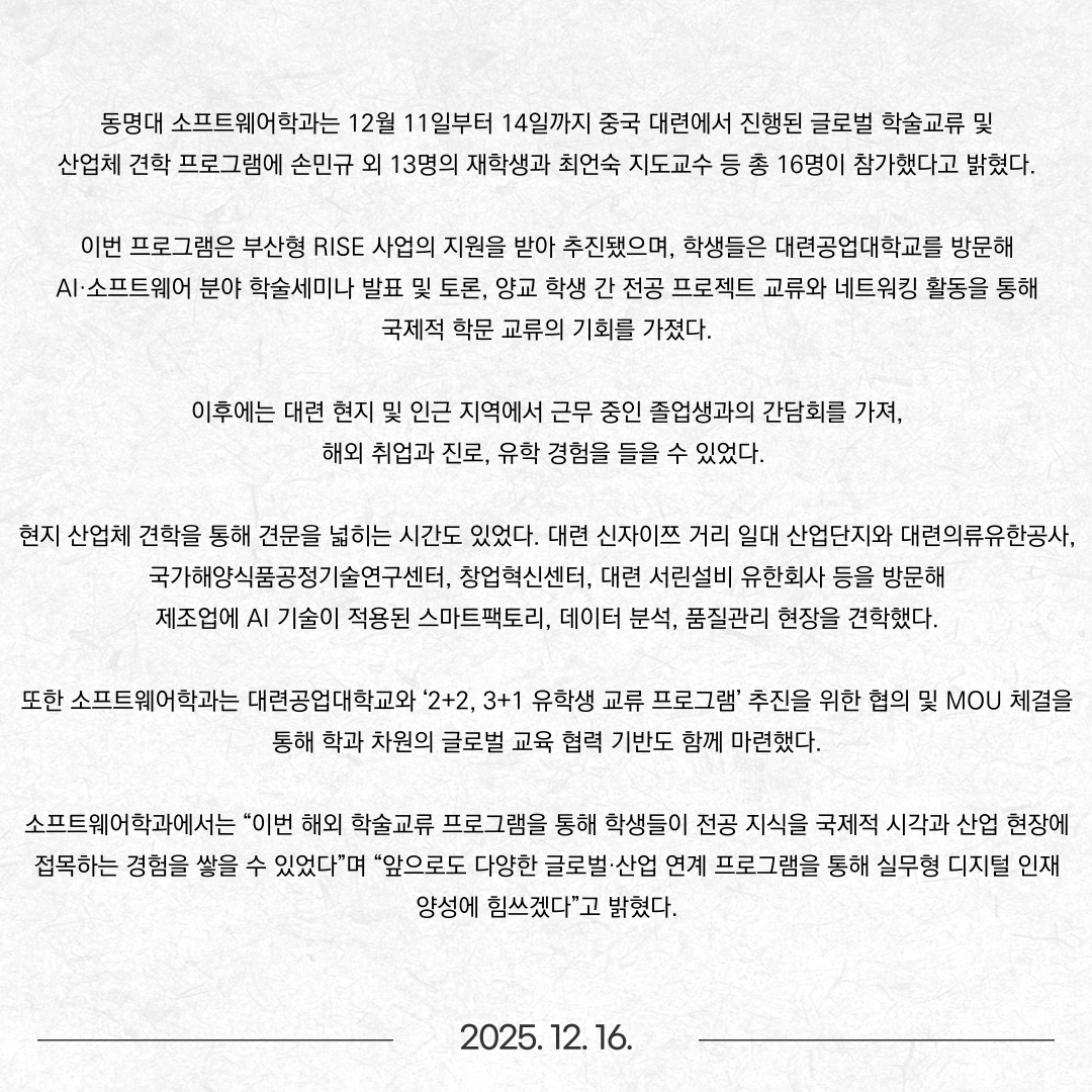 동명대 소프트웨어학과, 중국 대련 학술교류 및 산업체 견학