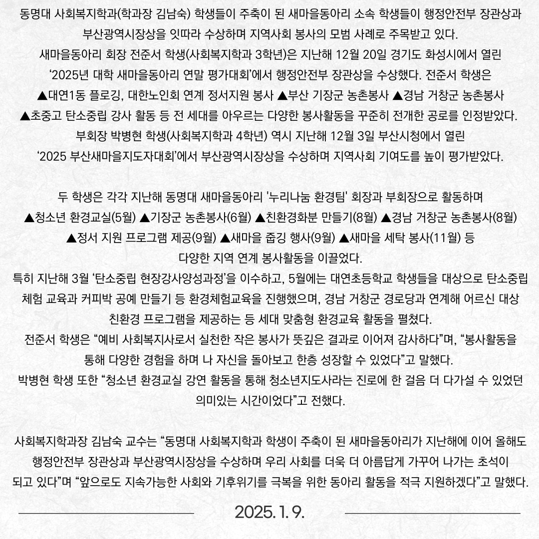 사회복지학과 학생들, 행안부 장관상·부산시장상 수상 쾌거