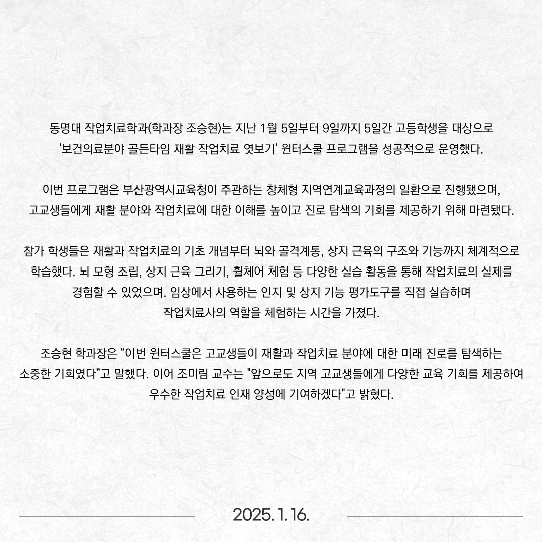동명대 작업치료학과, 고교생 대상 '작업치료 윈터스쿨' 성료