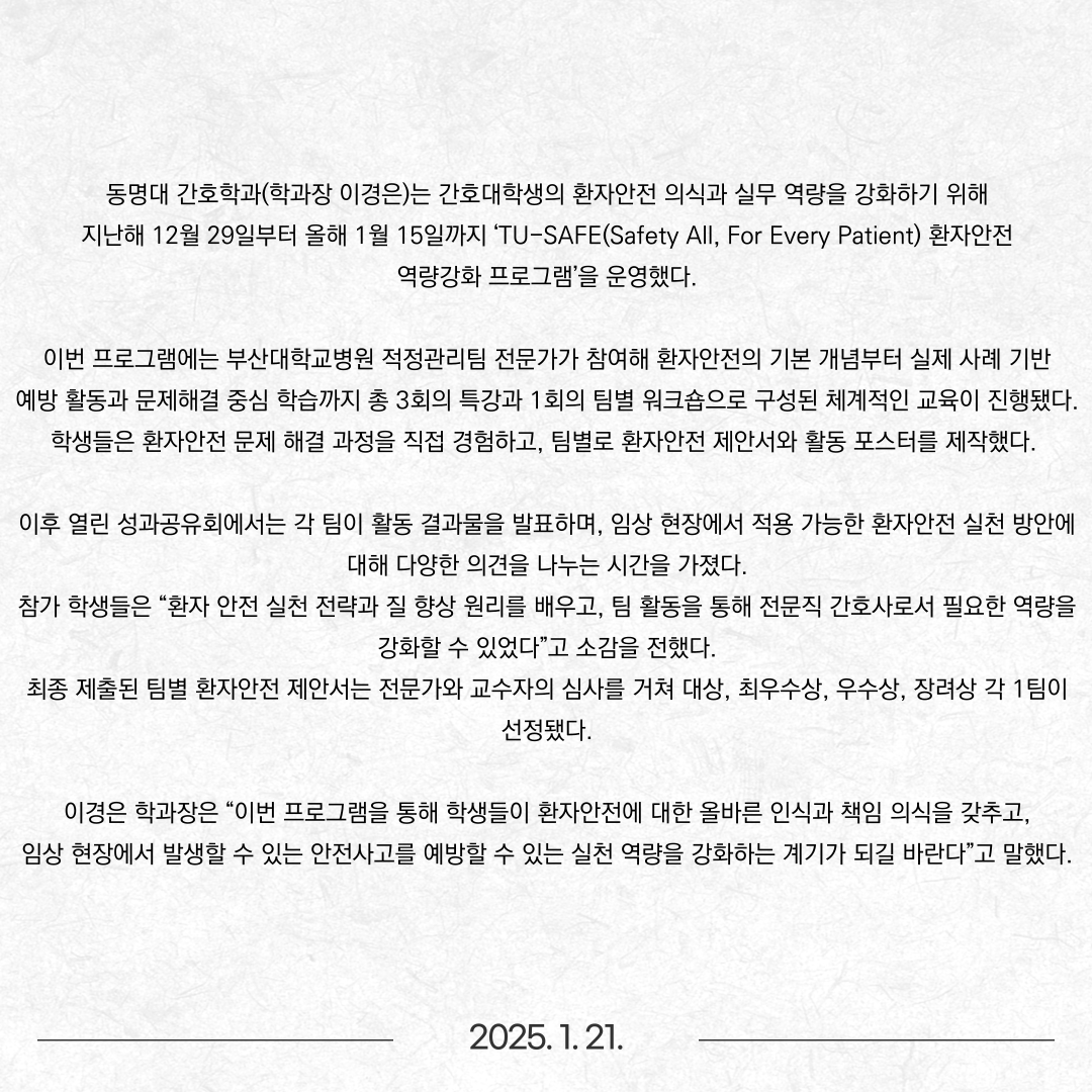 동명대 간호학과, TU-SAFE 환자안전 역량강화 프로그램 운영