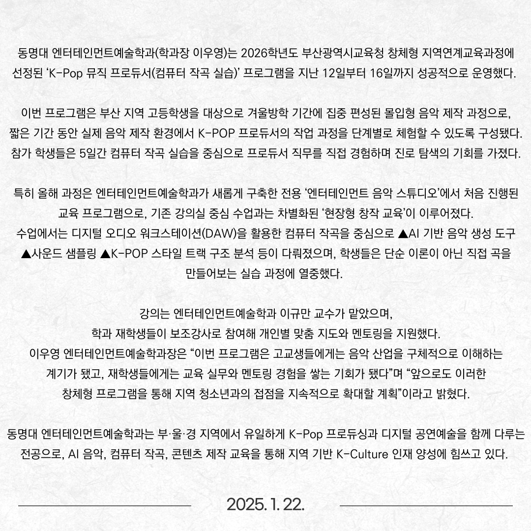동명대 엔터테인먼트예술학과, 부산교육청 창체형 지역연계교과과정 성료
