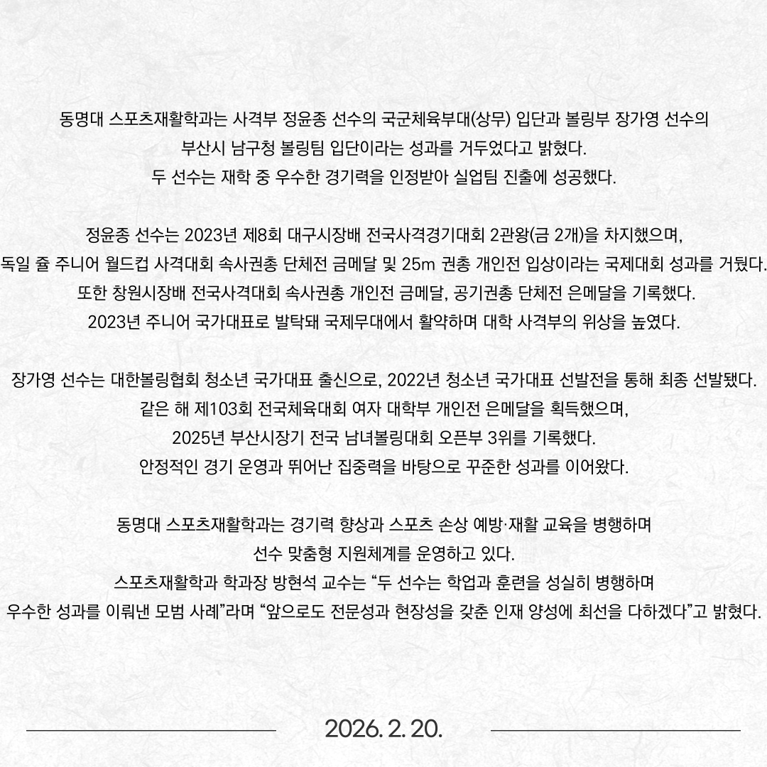 동명대 스포츠재활학과 엘리트 선수 2명 실업팀 입단
